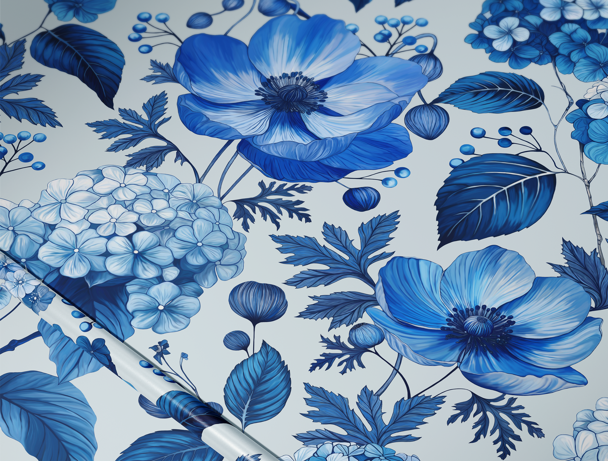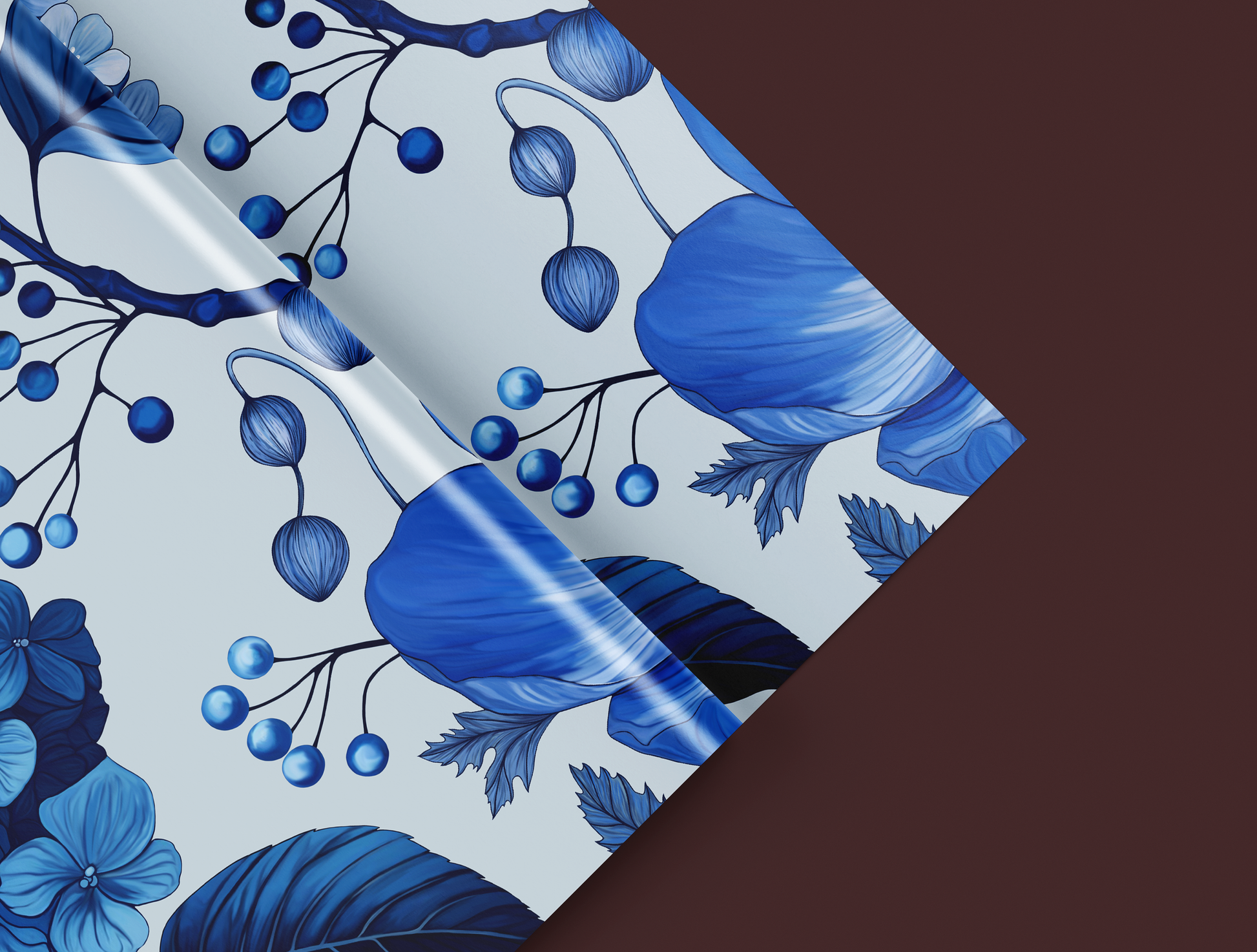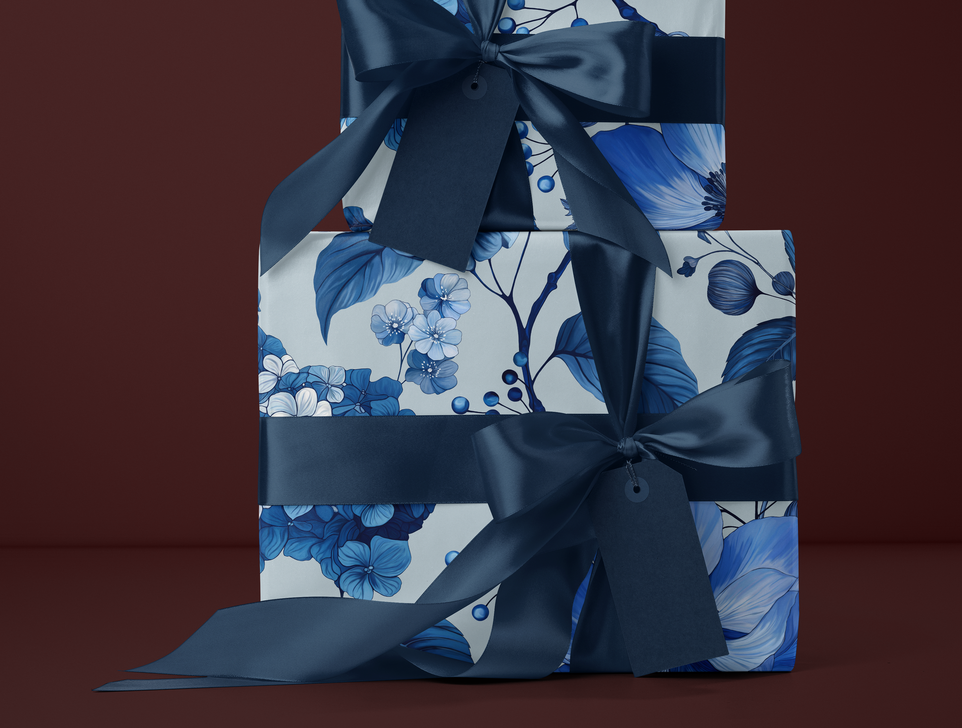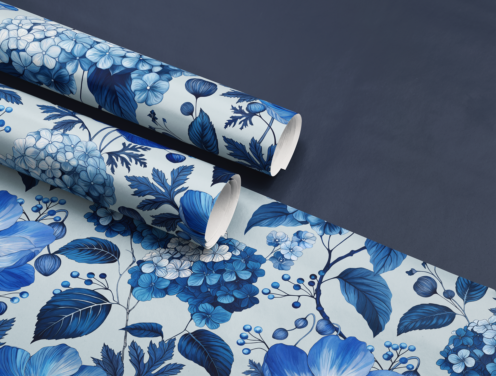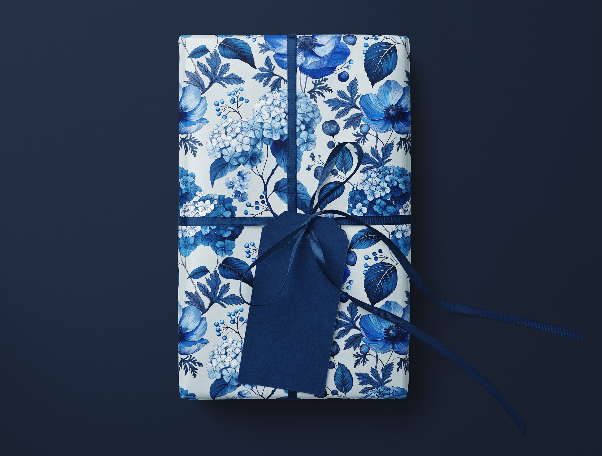 Inspired by classic toile patterns, this design features delicate floral illustrations in elegant blue tones, creating a refined and sophisticated look. The intricate details evoke a vintage charm while maintaining a modern, minimal feel. Perfect for weddings, birthdays, or holiday gifts, this wrapping paper turns every package into a beautifully wrapped keepsake.