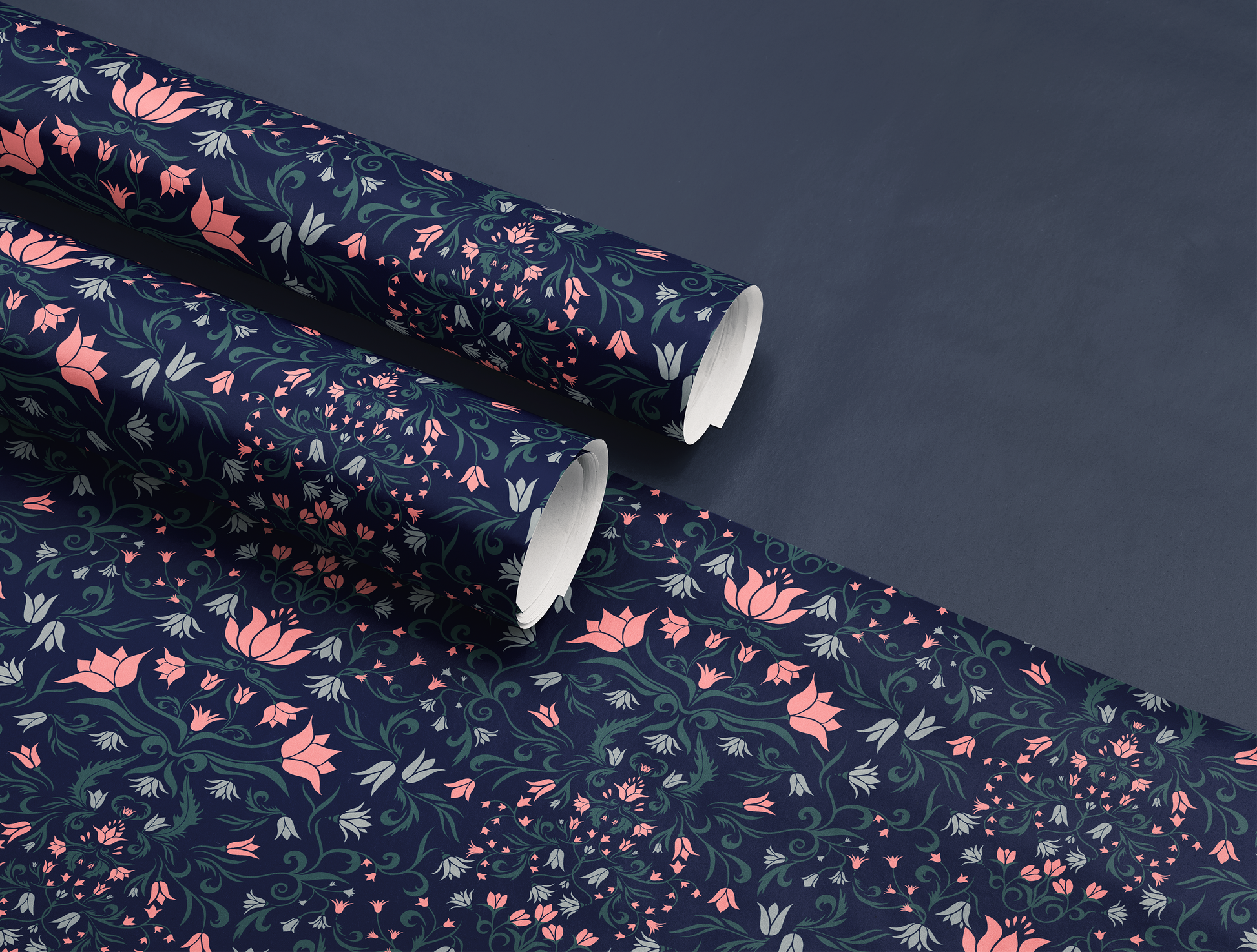 This striking pattern showcases soft coral pink tulips and bell-shaped accents on a deep navy blue background. Its seamless design creates harmony, blending timeless charm with a modern, sophisticated feel. Perfect for birthdays, weddings, anniversaries, or any special occasion that calls for a refined floral accent. Ideal for designers, crafters, or anyone looking to add a vibrant botanical touch to their projects.