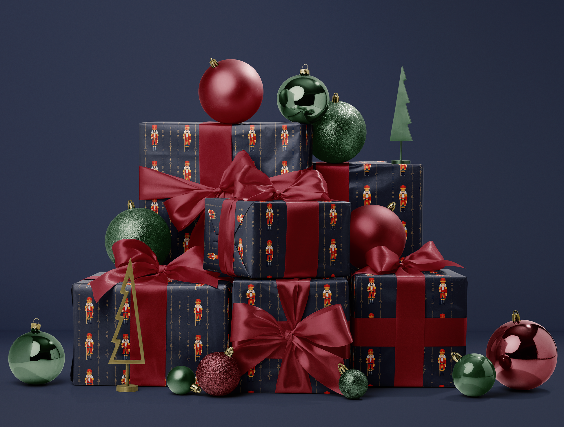 Celebrate the holidays with our charming Nutcracker wrapping paper. This playful design features a classic Nutcracker figure arranged in a repeating striped pattern, bringing festive cheer and timeless holiday elegance to your gifts.